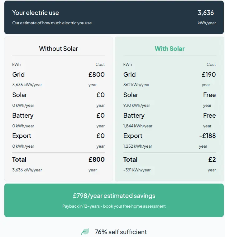 With a well located south-facing roof with minimal shading, a 5.16kW (12 panel) system coupled with a solar storage battery, could save you somewhere in the region of £560 – £850, based on the current average UK electricity price of 26p per kWh.