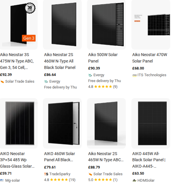 As you can see below, you should expect to pay approximately £80-£90 per panel. This is comparable to the likes of LONGi and JA Solar. And therefore, you’ll make huge savings when using AIKO in comparison to the likes of Maxeon (typically much more expensive).