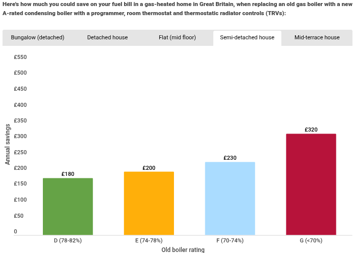 Here’s an example of how inefficient old boilers are in comparison to new A-rated boilers: