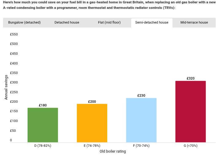 Even if you have a relatively new boiler that’s D-rated, you should expect annual savings of roughly £180 on your gas bill. And that figure rises as high as £320/yr for those with a G-rated boiler.