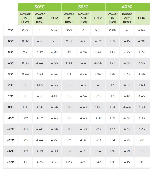 Increase this flow temperature to 40°C? You'll see this COP rating drop from 4.54 (454% efficient) to 3.39 (339%). It’s then only producing 3.39kWh of heat for every 1kWh of heat it consumes.