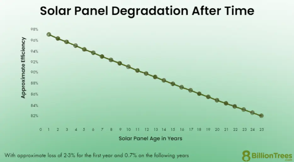 Typical solar panels will degrade at somewhere between 2-3% in year one and up to 0.7% in subsequent years.