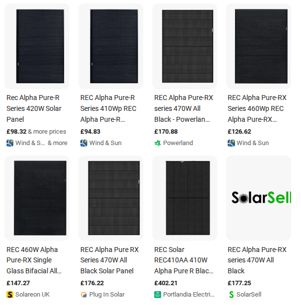 As you can see below, prices generally start at around £100 per panel for the REC Alpha Pure-R.