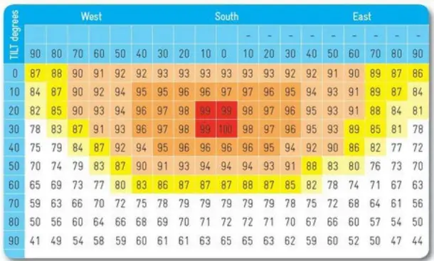 We’ve created a full guide to roof suitability for solar panels here. But, this useful graphic from the Energy Saving Trust shows exactly how pitch and orientation reduces peak output of your system as you drift further away the optimal roof type (30 degree pitch and facing due south):