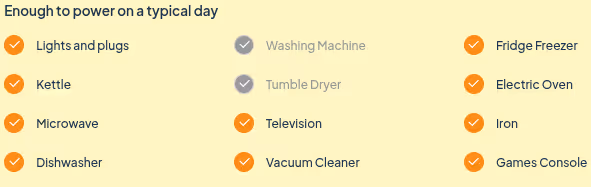 Appliances that use heating or cooling (microwaves, ovens, kettles and fridge freezers) are generally high wattage. Whilst a 5kW battery would be able to power 1-2 of these appliances, it won't be able to power all of them alongside the list above.