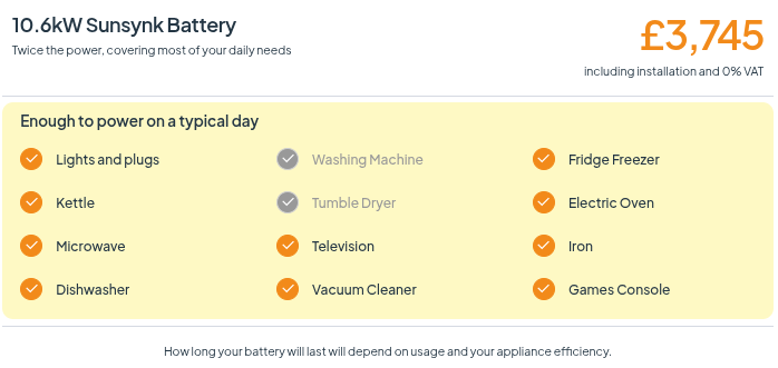 For example, if an appliance is rated as 5kW and you have a 5kW battery, that’s all you’ll be able to power.