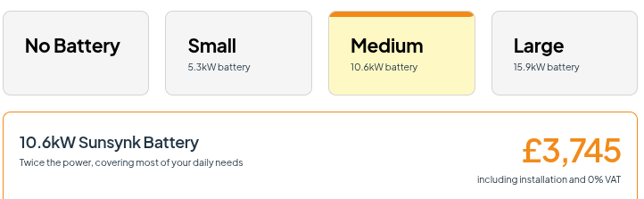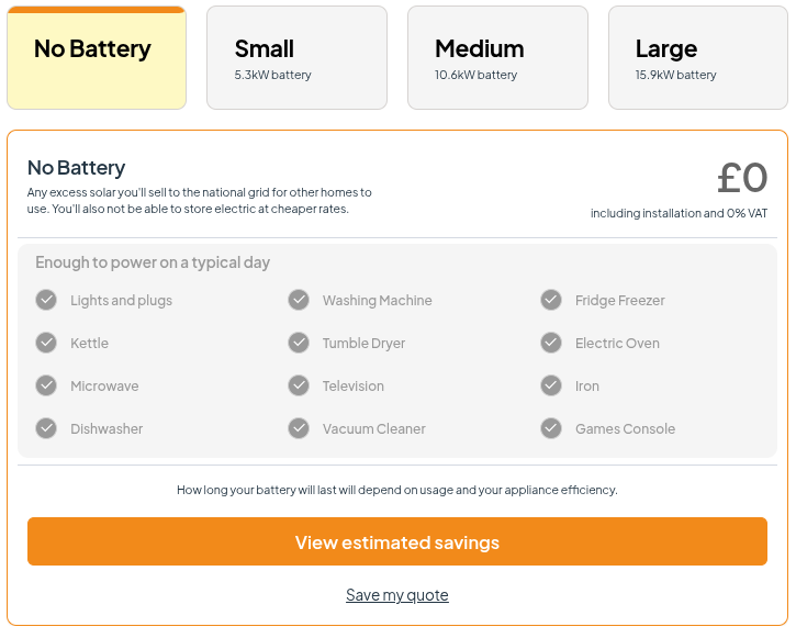 Obviously you’ll need to balance this with cost. A solar battery is likely to cost a minimum of £2,495 and prices rise quickly the larger the battery is!