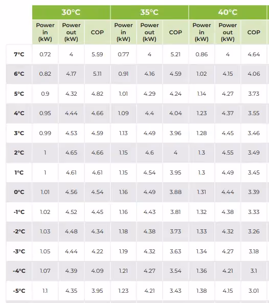 Increase this flow temperature to 40°C? You'll see this COP rating drop from 4.54 (454% efficient) to 3.39 (339%). It’s then only producing 3.39kWh of heat for every 1kWh of heat it consumes.