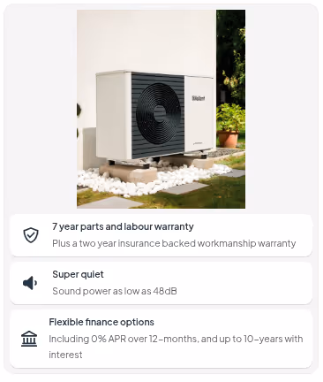 For that, you'll get a high spec heat pump from a leading brand such as Ideal, Vaillant, Grant or Daikin.