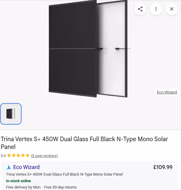 Looking at the Trina range, you’d be looking at something like their popular 455W Vertex S+ panels. Typical prices online for these PV modules sits in the region of £110-£120 (per panel).